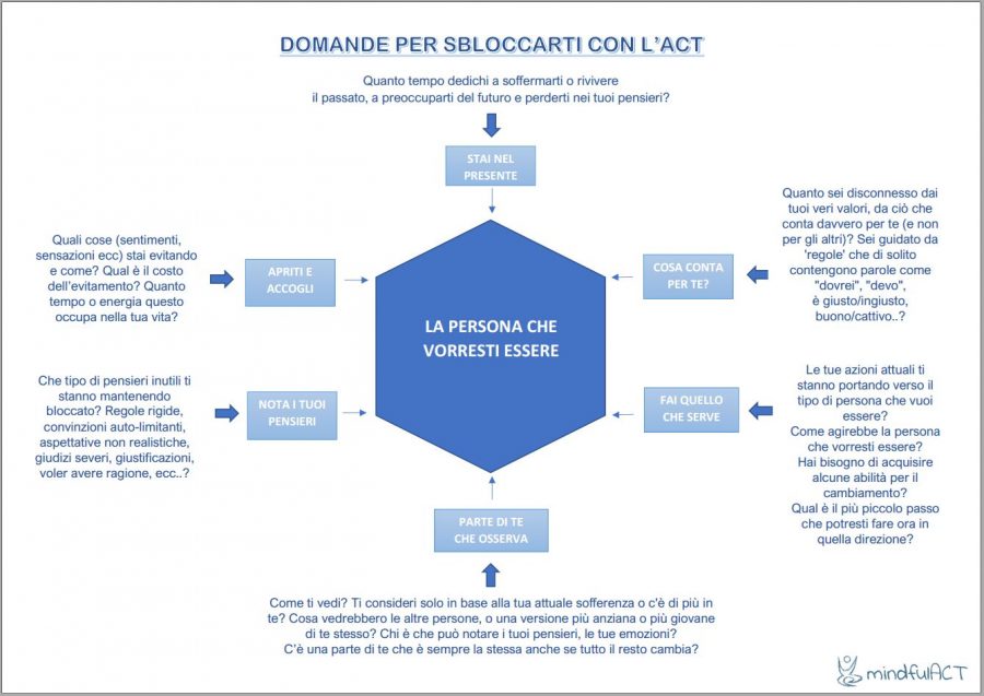 Quando ti senti bloccato e/o vorresti liberarti della tua sofferenza, dei tuoi pensieri spiacevoli o quando non sai come affrontare una situazione o una difficoltà, prova a seguire questa infografica che ti aiuterà a fare qualche passo verso la persona che vorresti essere. Un pratica ACT avanzata, per sbloccarti e guidarti verso la persona che vorresti essere. Non è necessario …